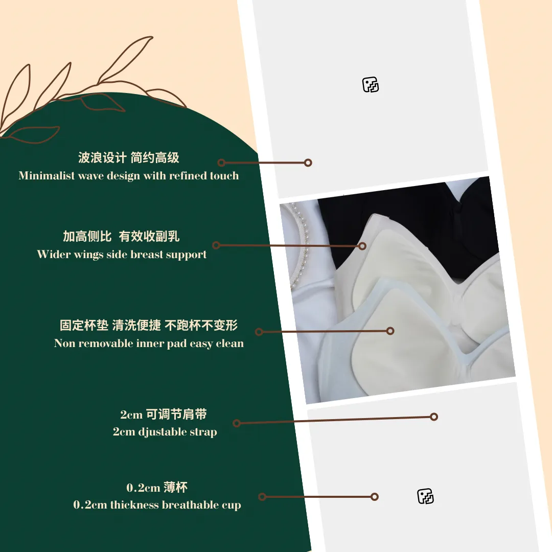独特的 水滴3D杯型,轻薄贴合胸型,不压迫,却悄悄勾勒出完美曲线。固定杯垫让你告别小麻烦——洗涤后依旧挺括,不跑杯、不变形,只为让你省心自在。